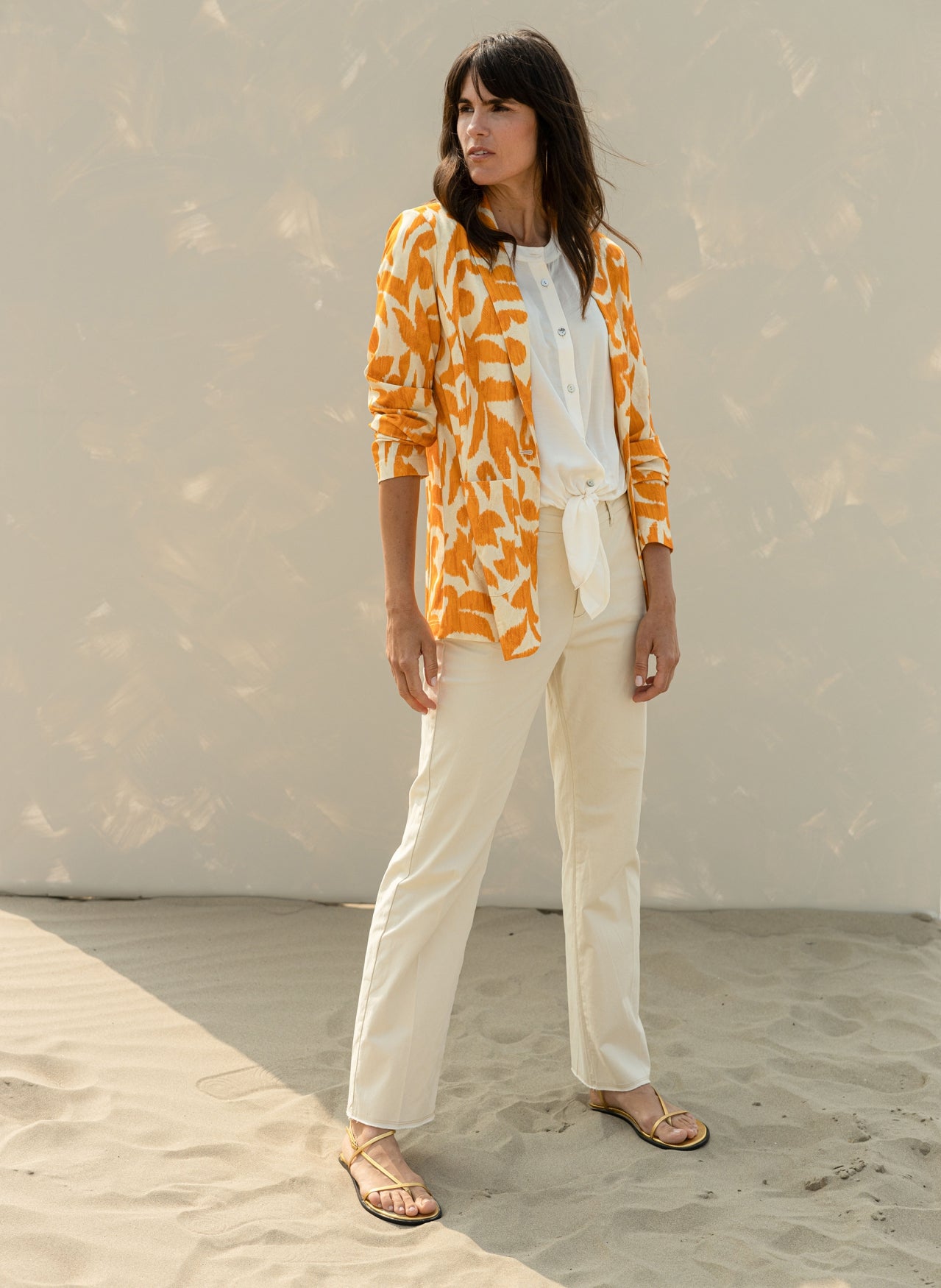This stylish unlined blazer combines modern design with comfort, making it the perfect summer jacket. Featuring a bold Ikat print and a flattering drawstring waist, it accentuates your figure while providing a lightweight, breathable fit. The unlined finish ensures a relaxed feel, ideal for warm-weather layering. Available in two versatile colours, pair it with the matching trousers to complete the chic set.