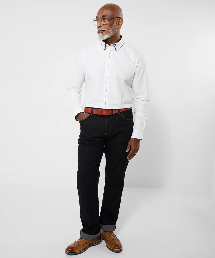 This crisp white men's shirt is a Joe Browns classic with a seasonal twist, ready to take top spot in your wardrobe. With our signature double collar and contrast buttonhole thread, it has an understated pop of personality that's great for the office. Roll up the sleeves for after-work drinks, and watch the floral trims transform your look.