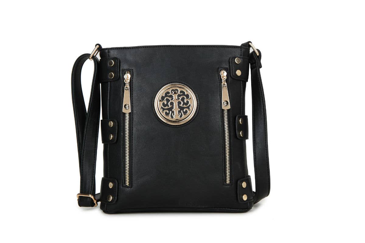 This crossbody bag has a top zip closure and includes two front pockets and a back zip pocket inside.