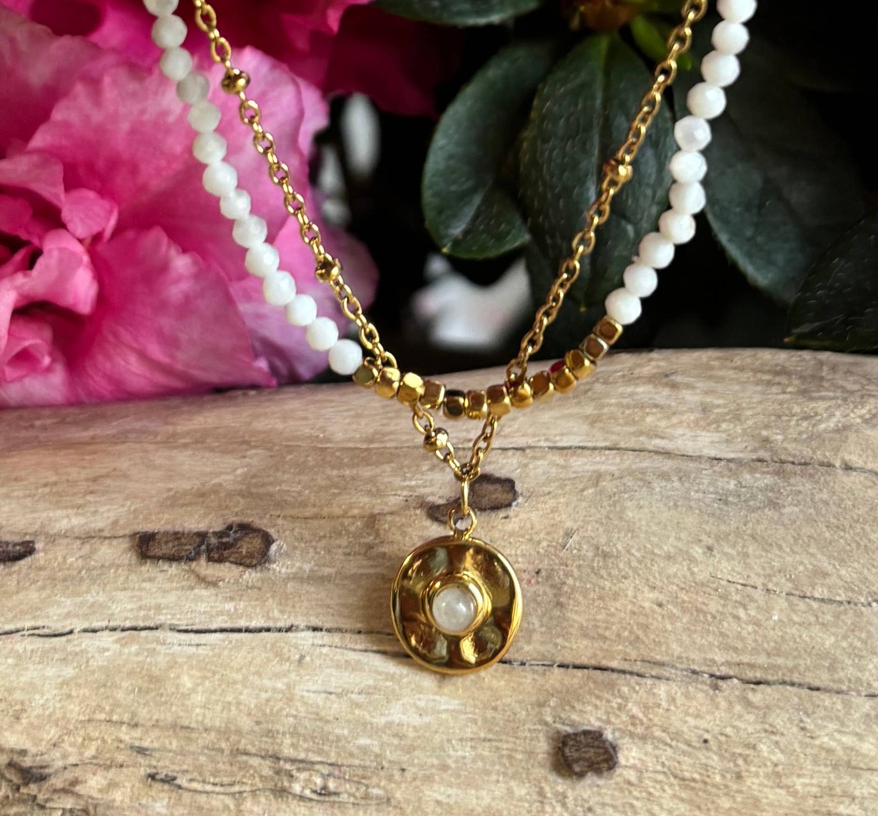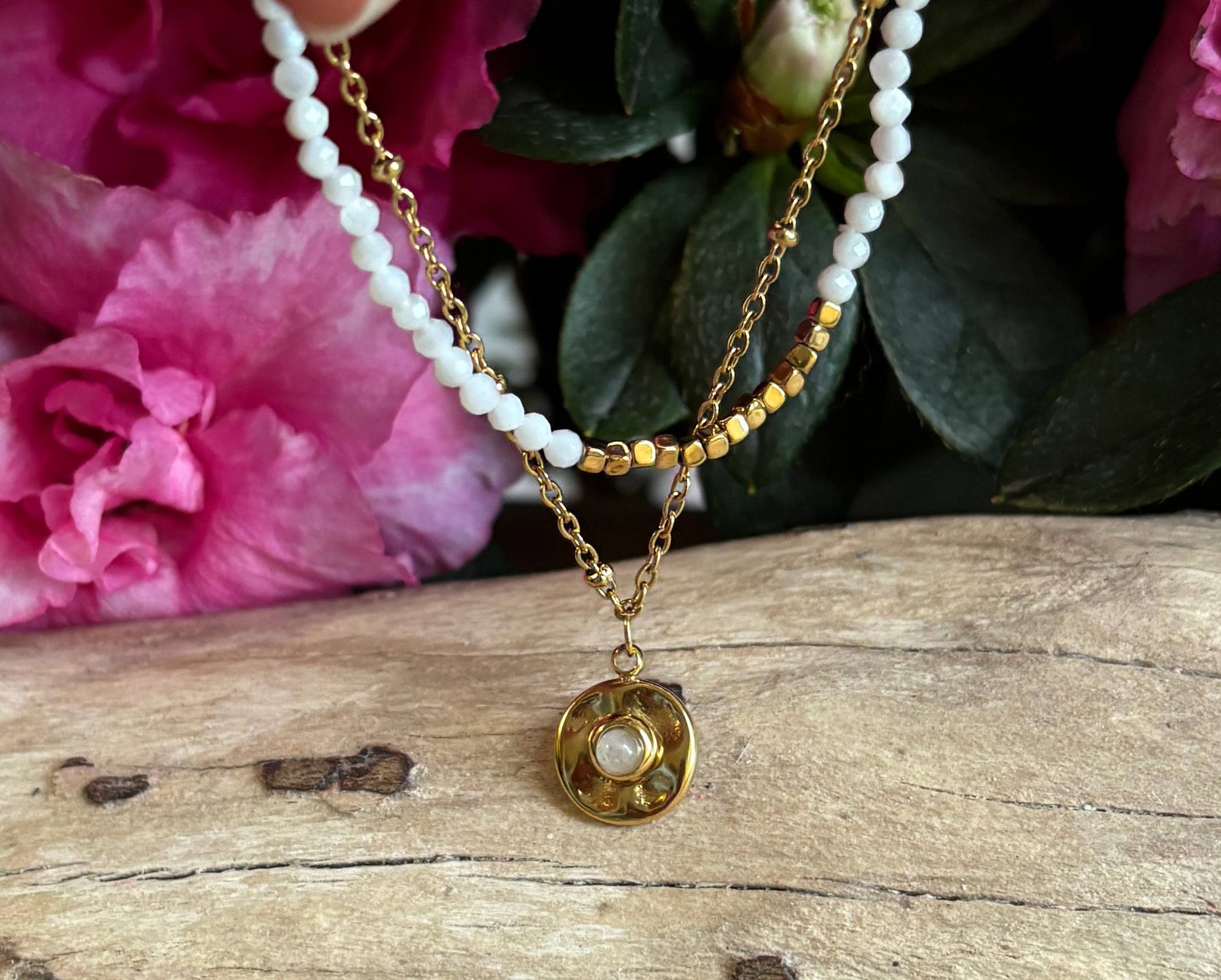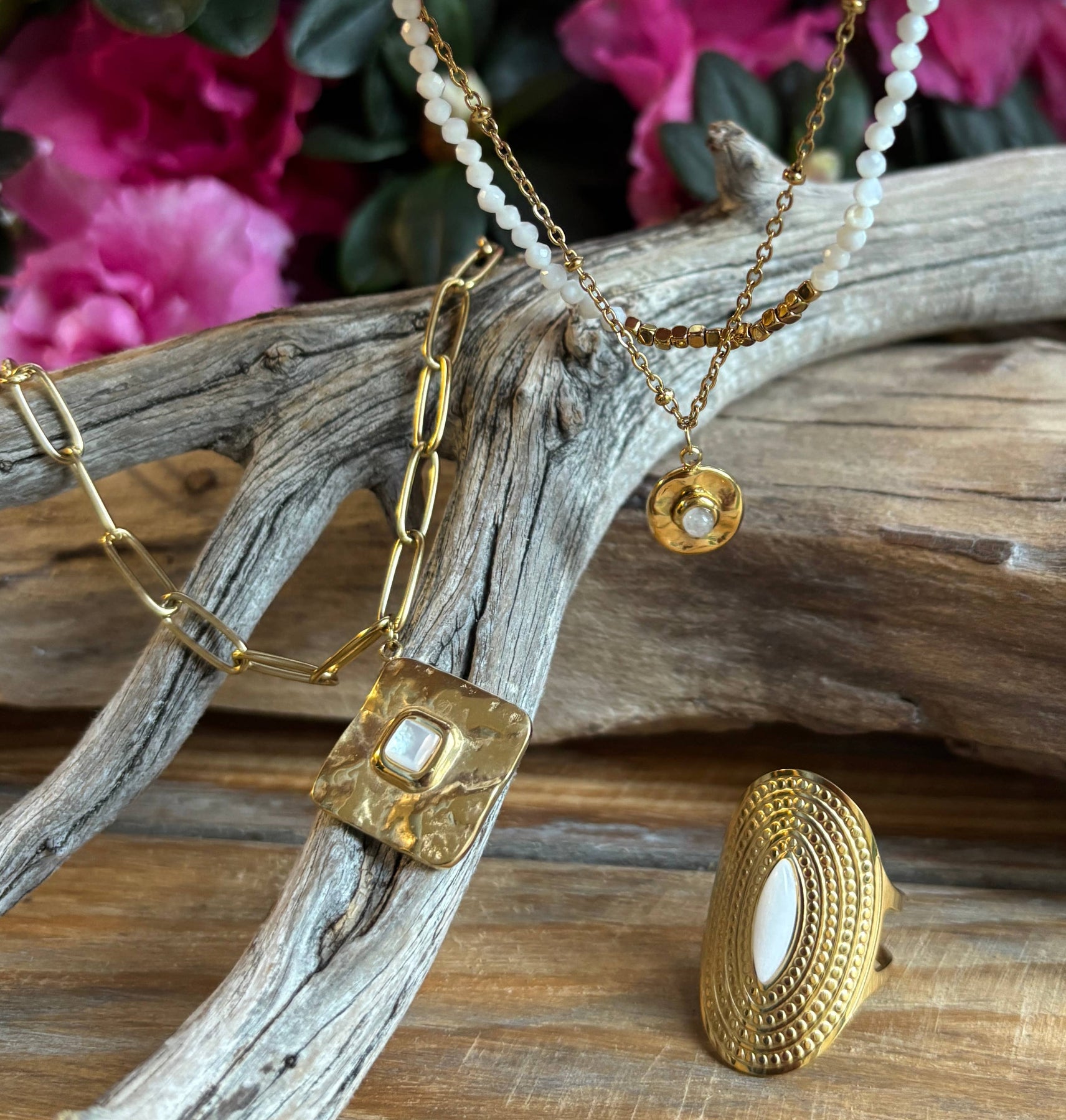 Elevate your everyday elegance with this 18ct Gold Plated Mother Of Pearl Gold Disc Bracelet, crafted from durable, tarnish-free and waterproof stainless steel. Featuring a lustrous mother of pearl disc that catches the light with soft iridescence, this bracelet brings a refined and delicate charm to your wrist.