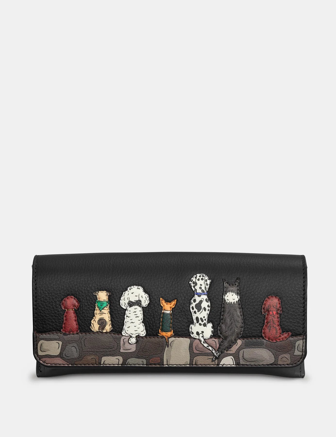Protect your glasses or sunglasses in style with this leather glasses case which has been produced in a black leather to highlight the colourful appliques on the front. This curious rabble of canine companions feature our favourite four-legged friends such as the Daschund, Pug, Poodle, Chihuahua, Dalmation, Border Collie and Spaniel. Here they sit on top of an old stone wall which adds further detail to this flap over leather glasses case. This pooch themed glasses case is fastened with a magnetic fastener.