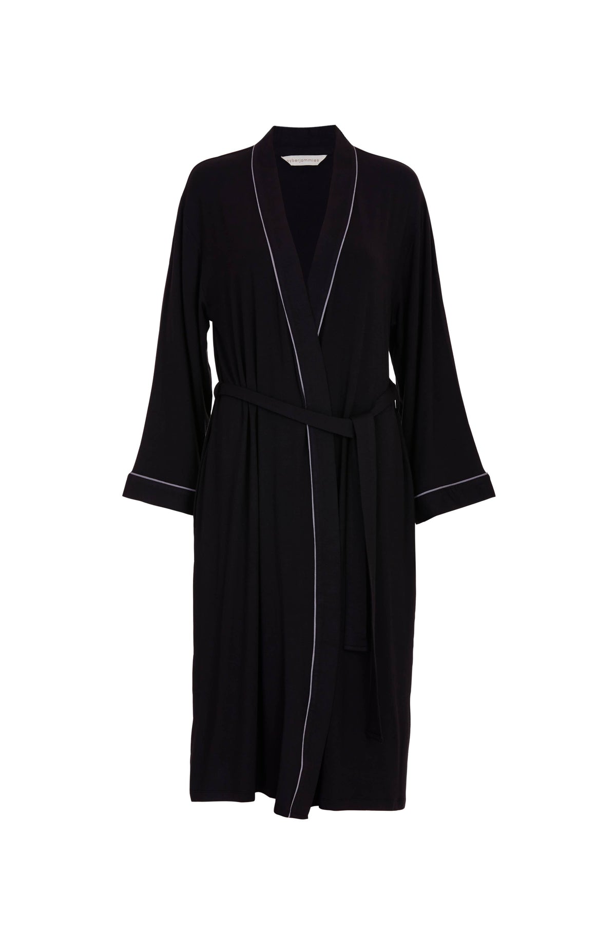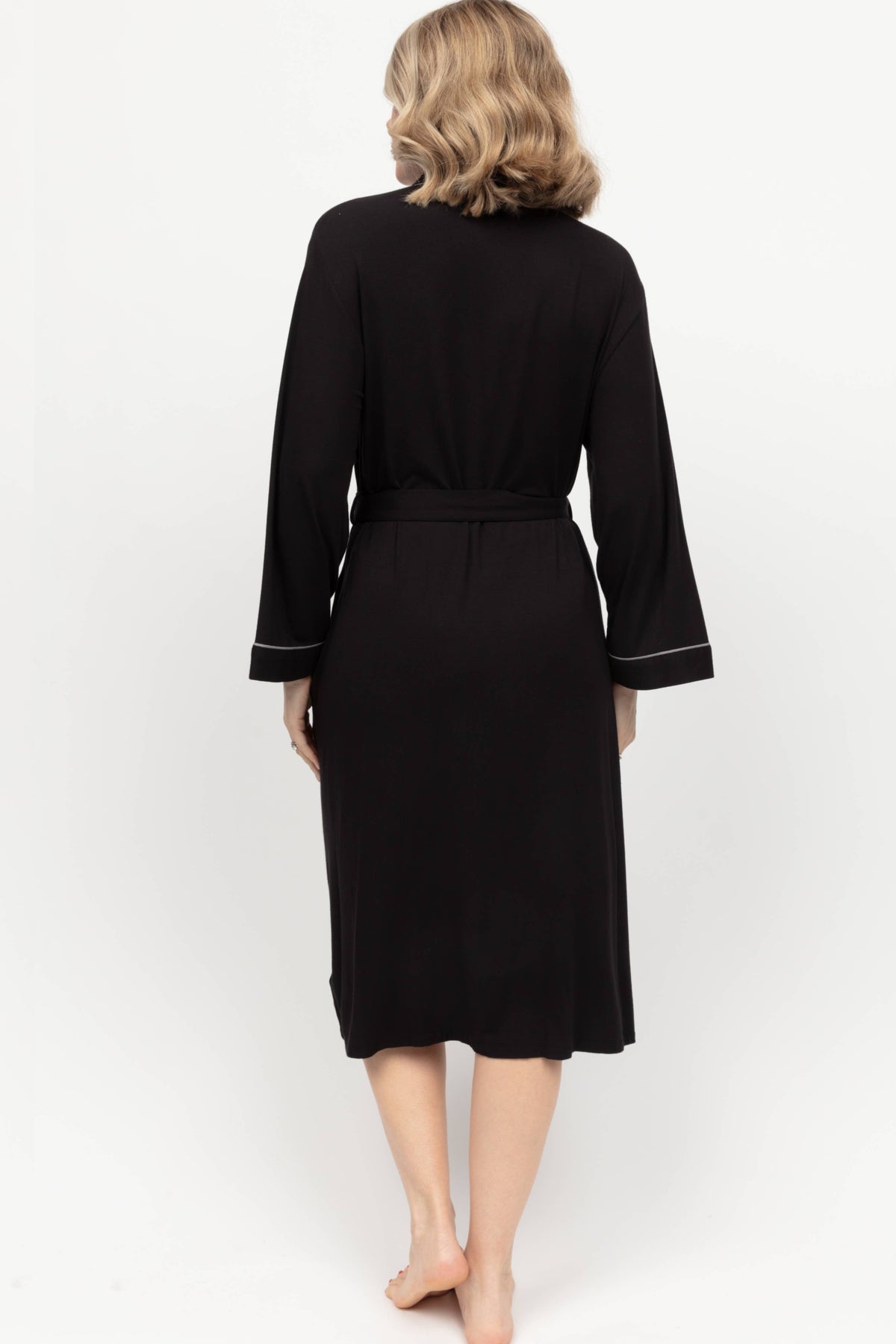 Immerse yourself in luxurious comfort and understated elegance with our Parker Black Jersey Long Sleeve Long Dressing Gown. Crafted from exquisitely soft 95% modal and 5% elastane fabric, this dressing gown envelops you in unparalleled softness and flexibility, making it the ideal coverall for your morning and evening routines. The timeless black hue, accentuated by sophisticated grey modal trim, gives a sophisticated aesthetic to the classic silhouette of this wrap-front Kimono style gown. The gown features long sleeves that provide both warmth and coverage, and fastens effortlessly with a self-fabric belt, meaning it allows for a customisable fit that flatters your silhouette. Complete with two side pockets for added convenience, this dressing gown seamlessly combines comfort and practicality. The old adage “black goes with everything” rings true here, so pair this gown with any of our pyjama sets, nightshirts, or nightdresses to elevate your loungewear collection with effortless elegance and timeless style.