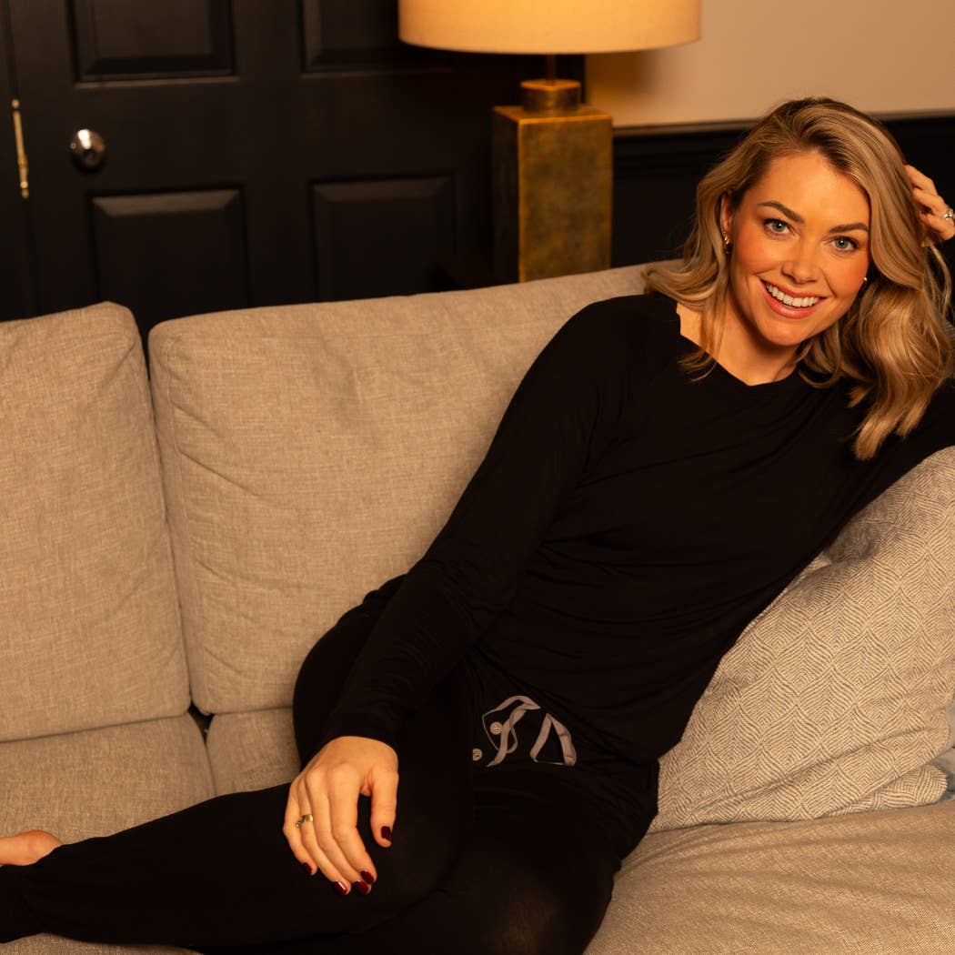 Unwind in pure comfort and style with our Black Slouch Jersey Pyjama Set, meticulously crafted for women who relish the combination of quality and relaxation. Made from a beautifully soft 95% modal and 5% elastane blend, this set envelops you in unbeatable comfort. The pyjama top, featuring short cap sleeves, a round front and back neck, and elegant self-fabric trim with dark green modal back neck tape, sets the tone for a tranquil bedtime experience. The coordinating pyjama bottoms, trimmed with dark green modal, offer an elasticated back with an adjustable drawstring at the front, dark green modal-covered buttons, and two side pockets. They are finished with cuffs at the ankles with gathers for a snug, comfy fit.