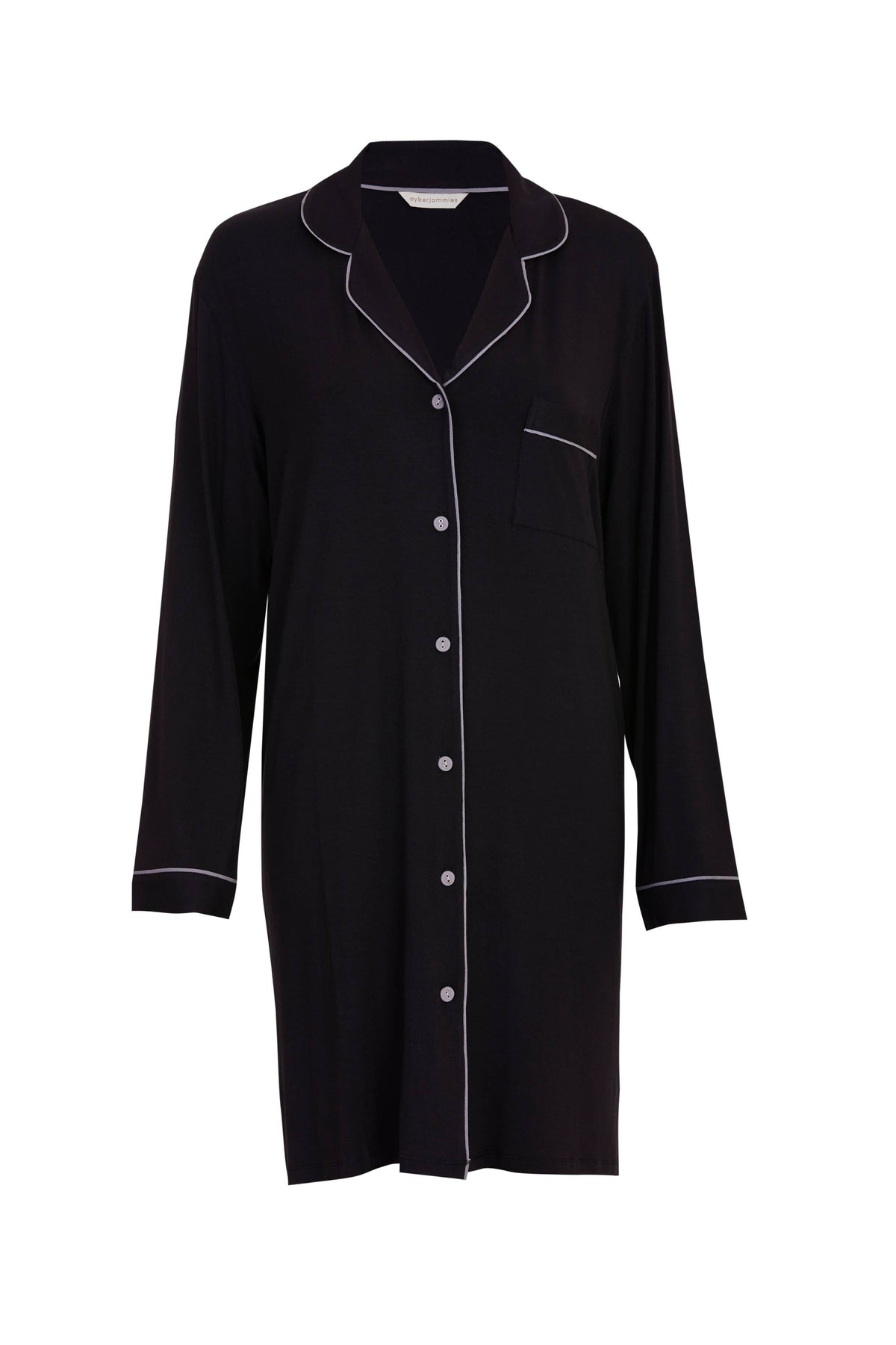 The Parker Black Revere Jersey Long Sleeve Nightshirt is your long-awaited answer to nighttime comfort and style, the well needed addition to your evening wardrobe. Immerse yourself in the luxurious comfort of our finely crafted blend of 95% modal and 5% elastane, promising nights of unparalleled softness and flexibility. The black hue envelops you in a cloak of midnight peace, while delicate grey modal trim adds a touch of understated elegance. With its revere collar and refined grey modal-covered buttons, this nightshirt exudes classic sophistication, whilst long sleeves and a shaped chest pocket offer both warmth and convenience, and the straight bottom hem ensures a flattering silhouette. Elevate your evening ritual with this nightshirt, a timeless piece that blends comfort and style seamlessly.