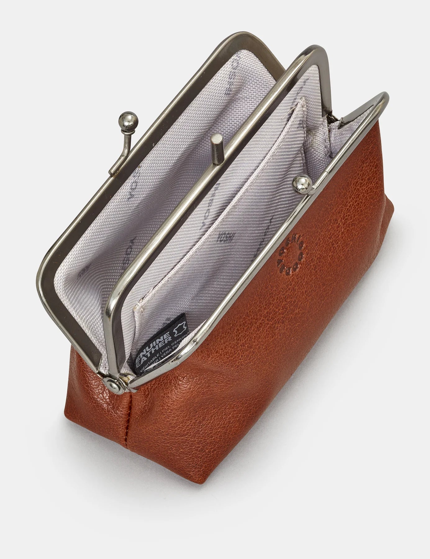 This Aubrey triple frame top brown leather women's purse from YOSHI is a classic shape with two main compartments and space for cards, coins, and notes when folded. This women's style with clip top fastening looks great both day and night. The frame purse is finished in our chestnut brown colour leather.