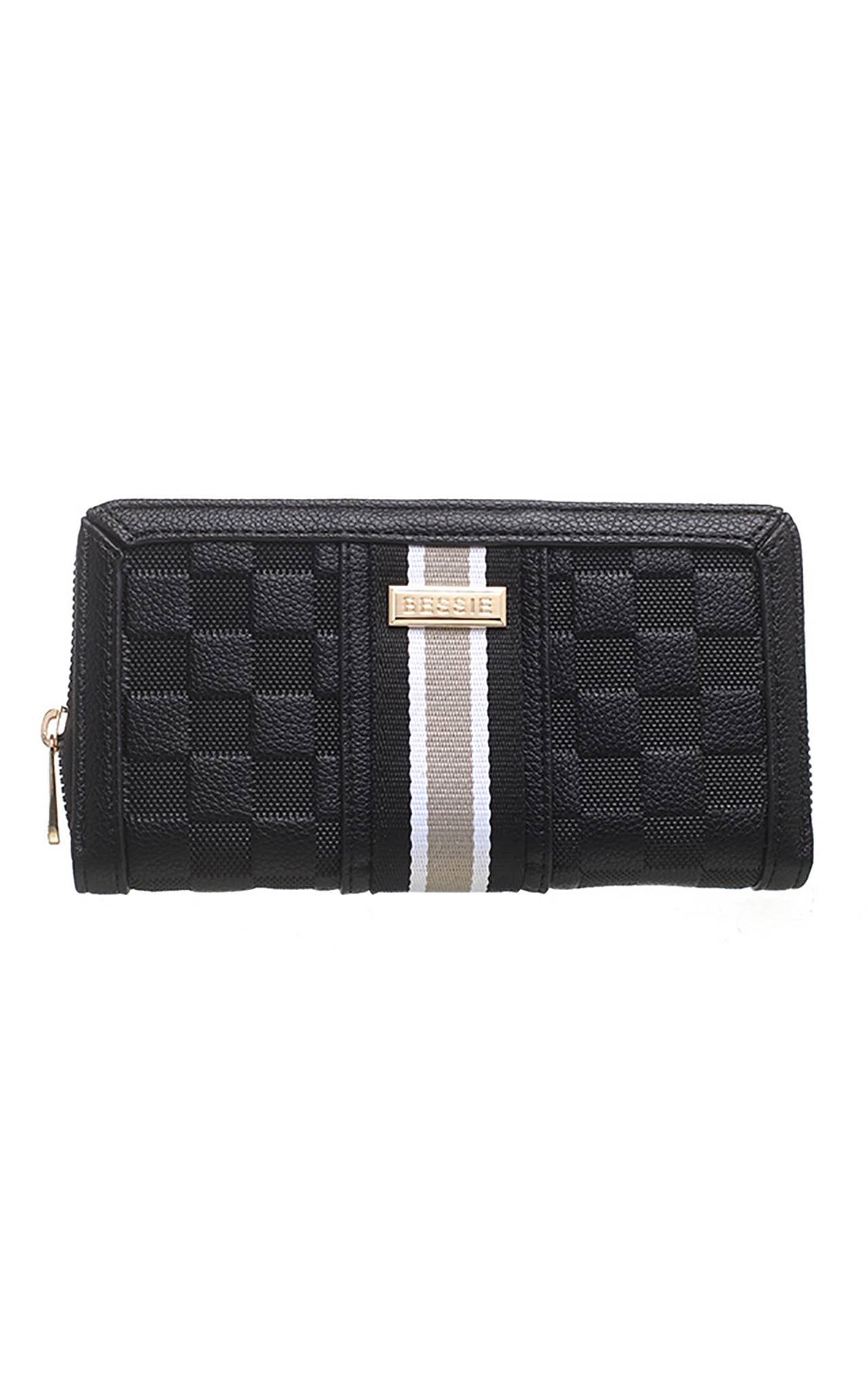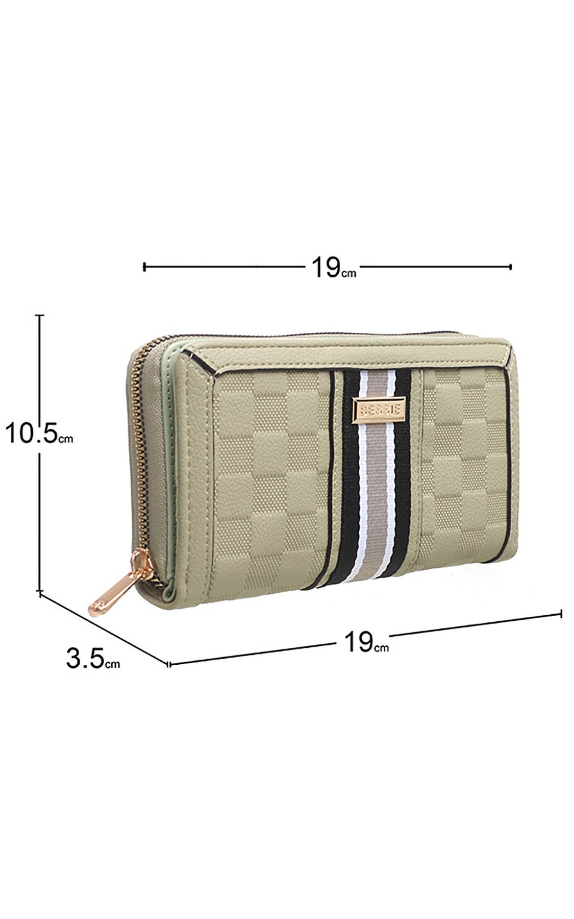 This stylish lady's wallet features interior card slots, a zip pocket, and a checkerboard design. It measures 19cm (L) x 10.5cm (H) x 3.5cm (W) and is made of high-quality PU with a polyester lining. Comes in a Bessie London paper box. To clean, wipe with a damp cloth. Avoid placing it near similar fabrics or bold colors in warm areas to prevent color transfer.