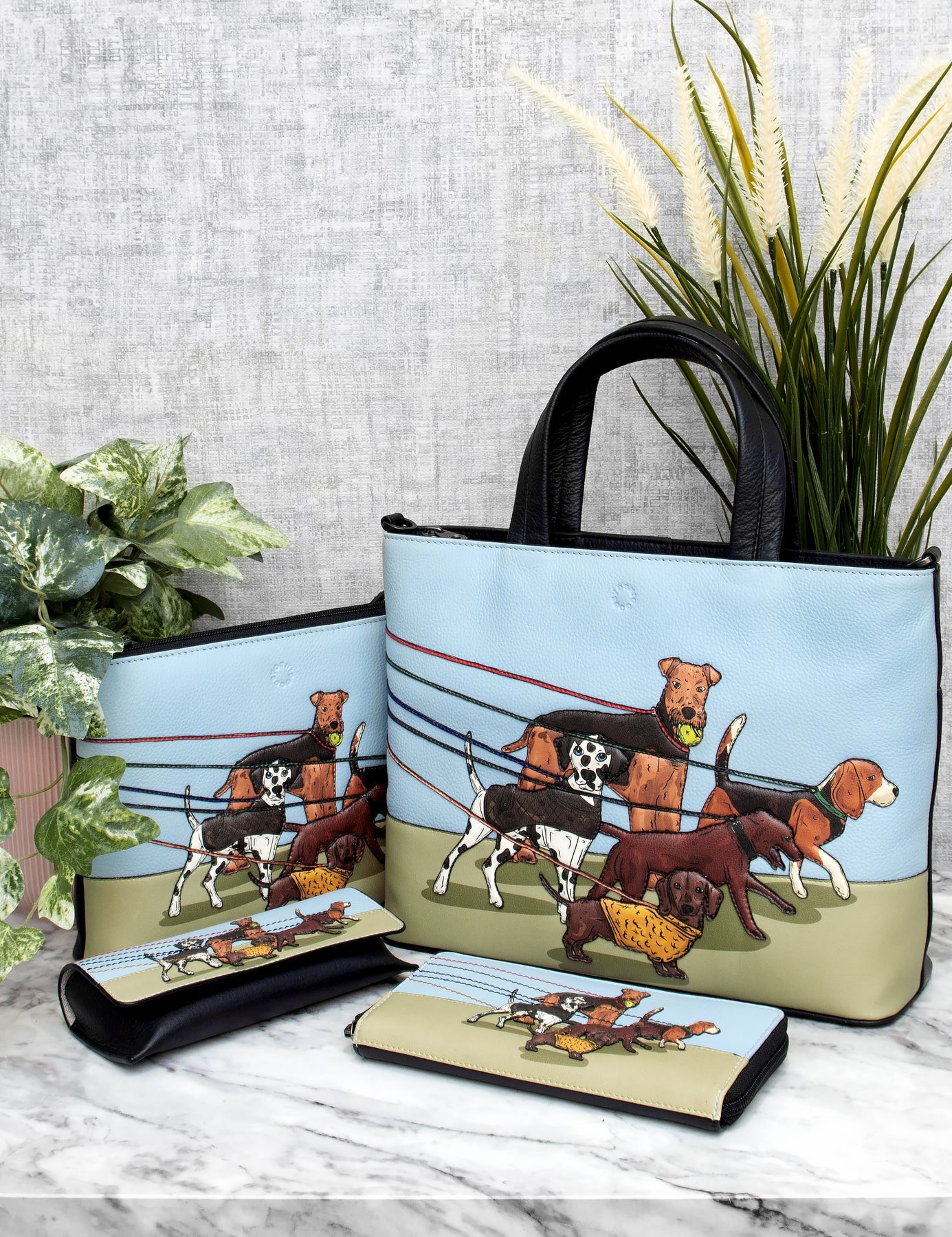 This black leather glasses case from YOSHI captures all the adventure of a Dog Walk and features a Dalmatian, Staffordshire Bull Terrier, Dachshund, Beagle, and Airedale Terrier which look perfect against the blue sky of the background. This dogs themed glasses case is fastened with a magnetic fastener and perfect for both sunglasses and reading glasses.