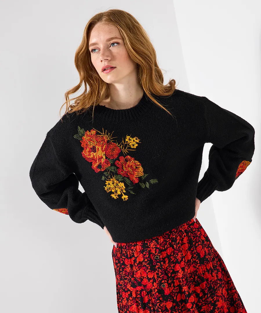 This crew-neck jumper puts a fresh spin on classic knitwear. Full of feminine flair with its chic balloon sleeves and floral embroidery, it's finished with ribbed cuffs for added comfort. Paired with jeans, skirts, dresses, and more, it'll create endless charming outfits this season.