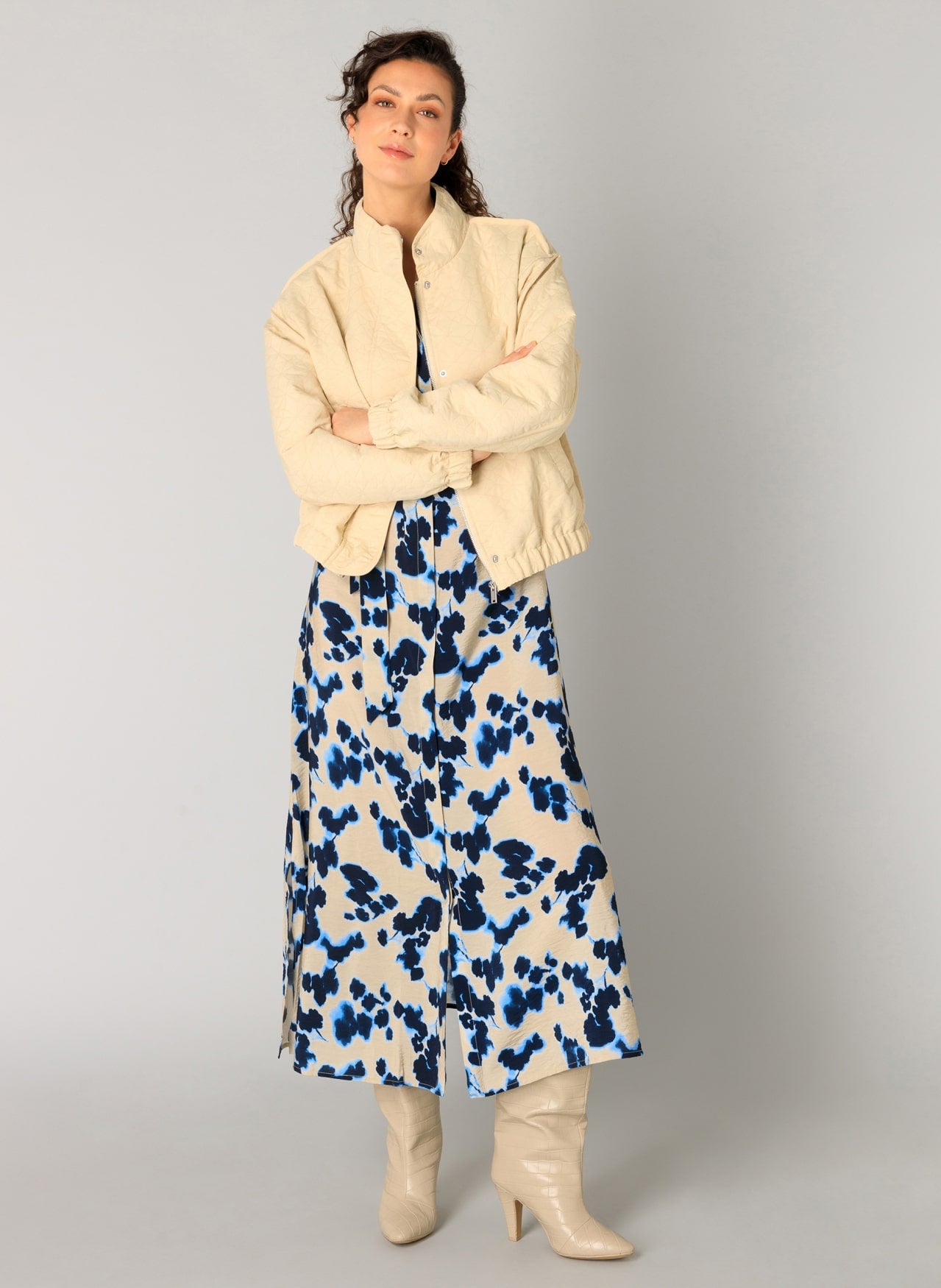 This button-through dress in a blue floral print on a beige background is made from airy viscose, making the dress breathable and comfortable to wear. The long-sleeved design with a bow belt allows you to accentuate the waist. The dress falls to mid-calf, and the slit in the side seam provides extra freedom of movement.