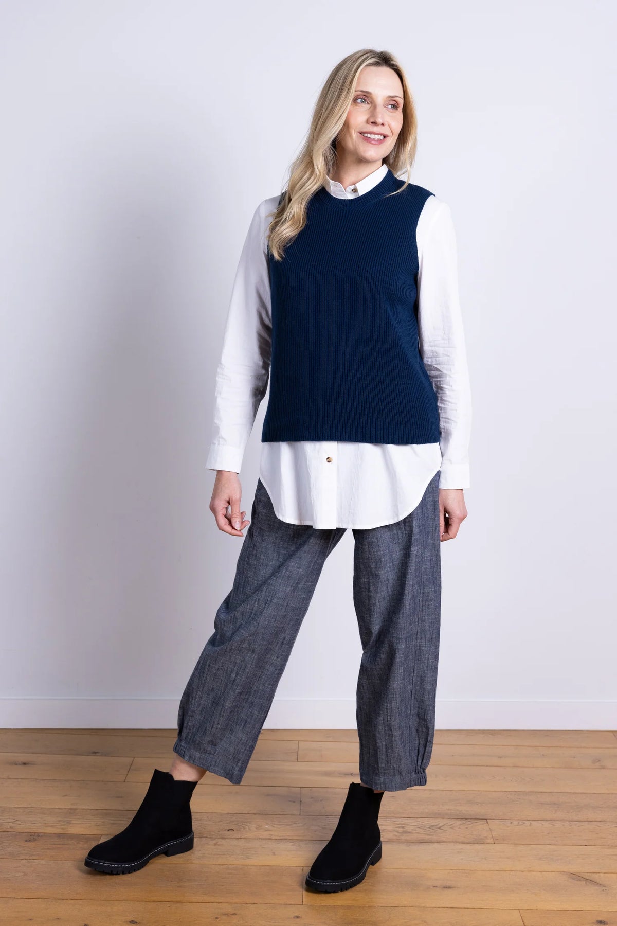 This beautiful knitted vest is the ultimate in cosy sophistication. The blend of organic cotton and wool creates a luxuriously soft and insulating fabric that will keep you comfortable in any climate. Slip it on over a button-down for the office, or pair it with your favorite jeans for a polished weekend look. With its classic silhouette and neutral hue, this vest is a wardrobe essential that will elevate your style effortlessly.